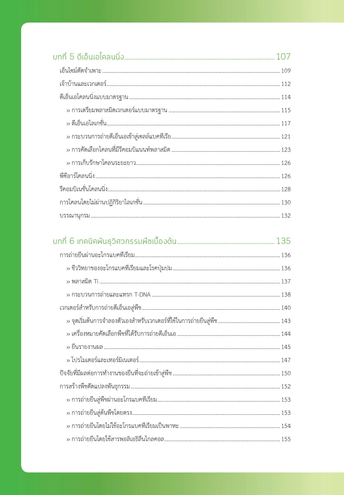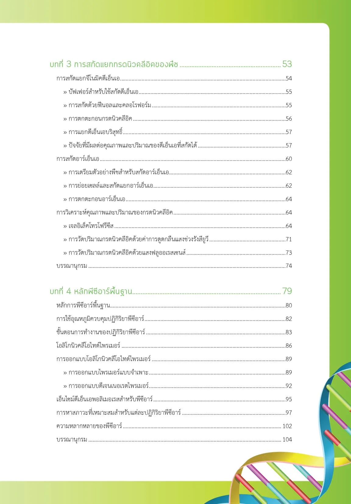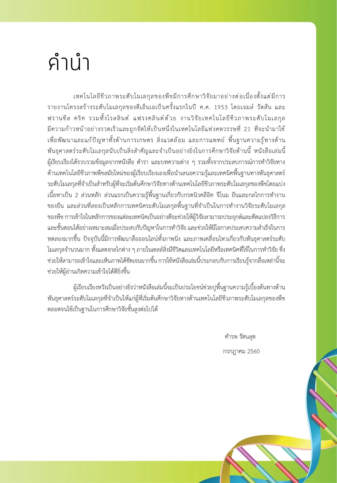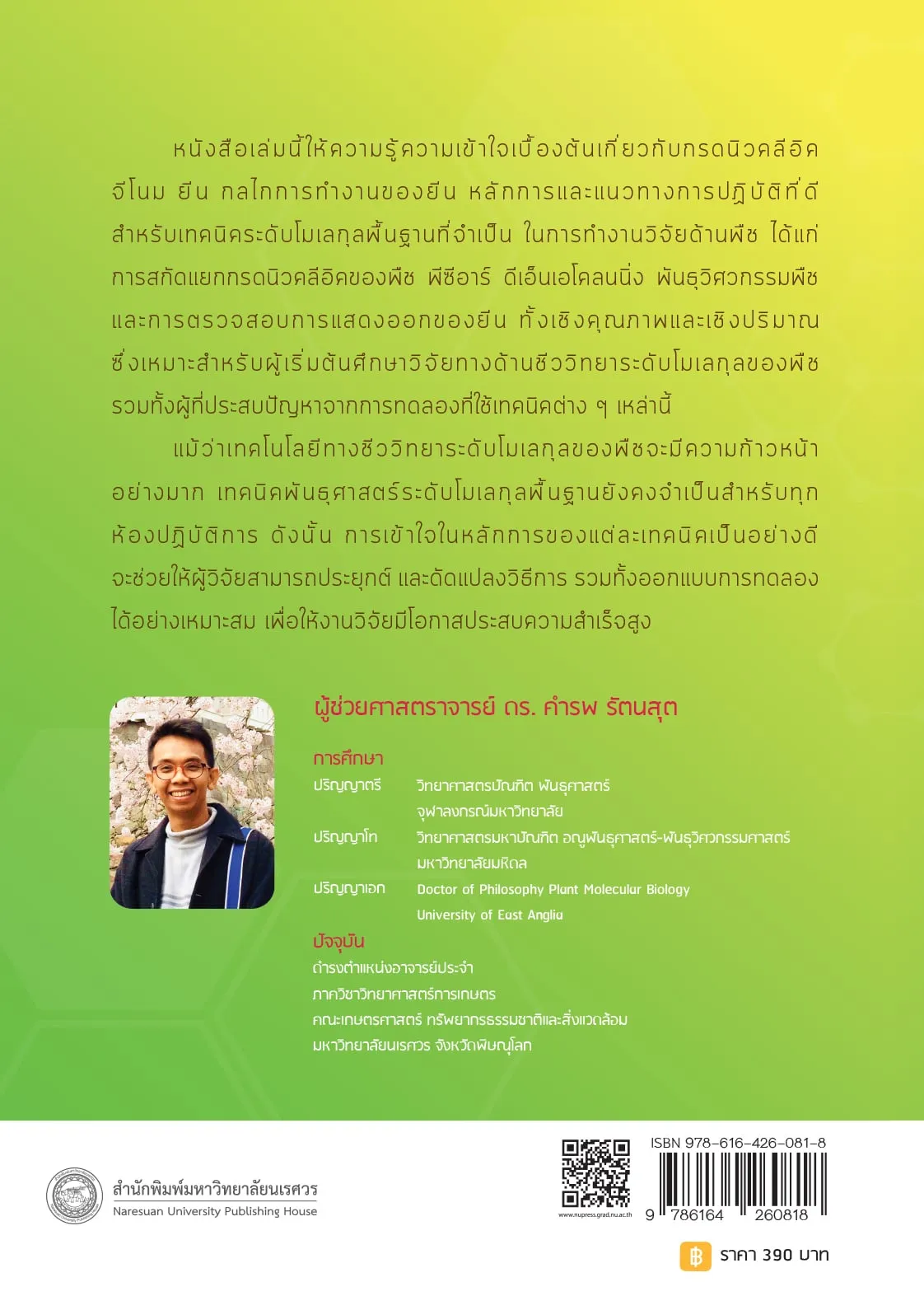 หนังสือเล่มนี้ให้ความรู้ความเข้าใจเบื้องต้นเกี่ยวกับกรดนิวคลีอิคจีโนม ยีน กลไกการทำงานของยีน หลักการและแนวทางการปฏิบัติที่ดี สำหรับเทคนิคระดับโมเลกุลพื้นฐานที่จำเป็น ในการทำงานวิจัยด้านพืช ได้แก่ การสกัดแยกกรดนิวคลีอิคของพืช พีซีอาร์ ดีเอ็นเอโคลนนิ่ง พันธุวิศวกรรมพืช และการตรวจสอบการแสดงออกของยีน ทั้งเชิงคุณภาพและเชิงปริมาณ ซึ่งเหมาะสำหรับผู้เริ่มต้นศึกษาวิจัยทางด้านชีววิทยาระดับโมเลกุลของพืช รวมทั้งผู้ที่ประสบปัญหาจากการทดลองที่ใช้เทคนิคต่าง ๆ เหล่านี้ แม้ว่าเทคโนโลยีทางชีววิทยาระดับโมเลกุลของพืชจะมีความก้าวหน้าอย่างมาก เทคนิคพันธุศาสตร์ระดับโมเลกุลพื้นฐานยังคงจำเป็นสำหรับทุกห้องปฏิบัติการ ดังนั้น การเข้าใจในหลักการของแต่ละเทคนิคเป็นอย่างดีจะช่วยให้ผู้วิจัยสามารถประยุกต์ และดัดแปลงวิธีการ รวมทั้งออกแบบการทดลอง ได้อย่างเหมาะสม เพื่อให้งานวิจัยมีโอกาสประสบความสำเร็จสูง