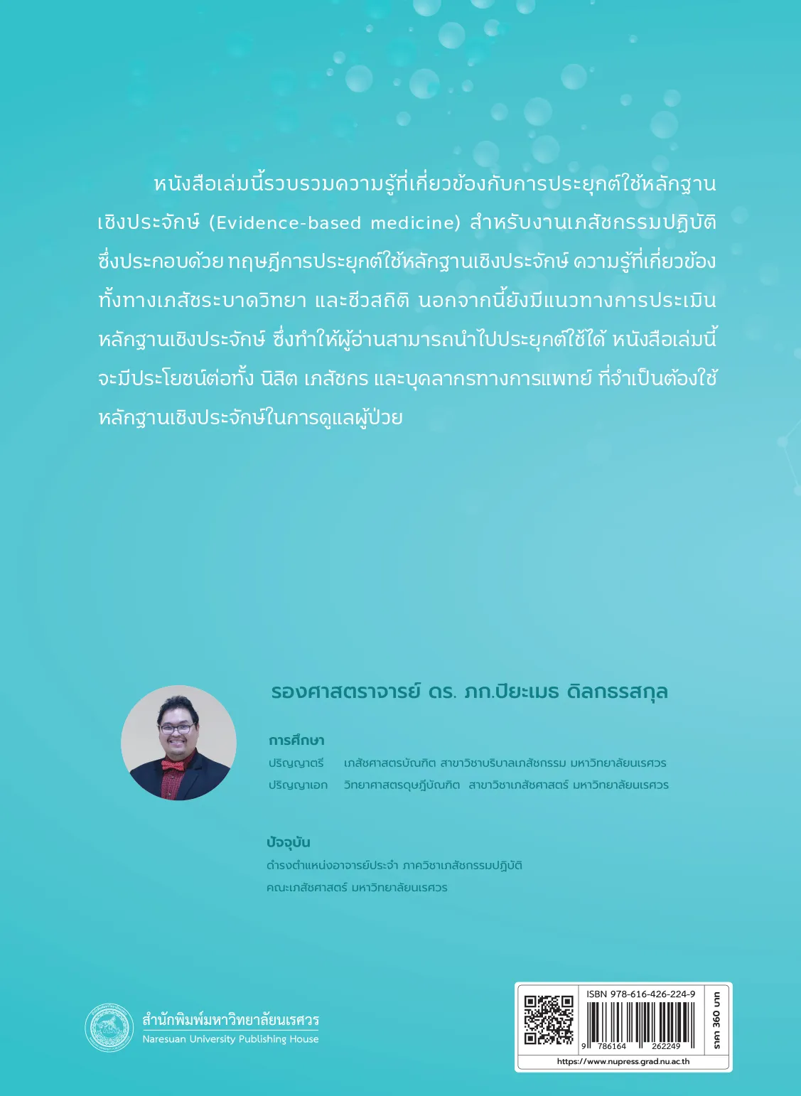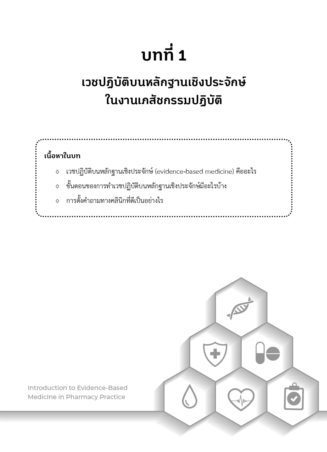 หนังสือเล่มนี้รวบรวมความรู้ที่เกี่ยวข้องกับการประยุกต์ใช้หลักฐาน เชิงประจักษ์ (Evidence-based medicine) สําหรับงานเภสัชกรรมปฏิบัติ ซึ่งประกอบด้วย ทฤษฎีการประยุกต์ใช้หลักฐานเชิงประจักษ์ ความรู้ที่เกี่ยวข้องทั้งทางเภสัชระบาดวิทยา และชีวสถิติ นอกจากนี้ยังมีแนวทางการประเมิน หลักฐานเชิงประจักษ์ ซึ่งทําให้ผู้อ่านสามารถนําไปประยุกต์ใช้ได้ หนังสือเล่มนี้จะมีประโยชน์ต่อทั้ง นิสิต เภสัชกร และบุคลากรทางการแพทย์ ที่จําเป็นต้องใช้หลักฐานเชิงประจักษ์ในการดูแลผู้ป่วย