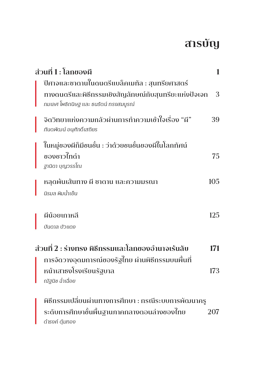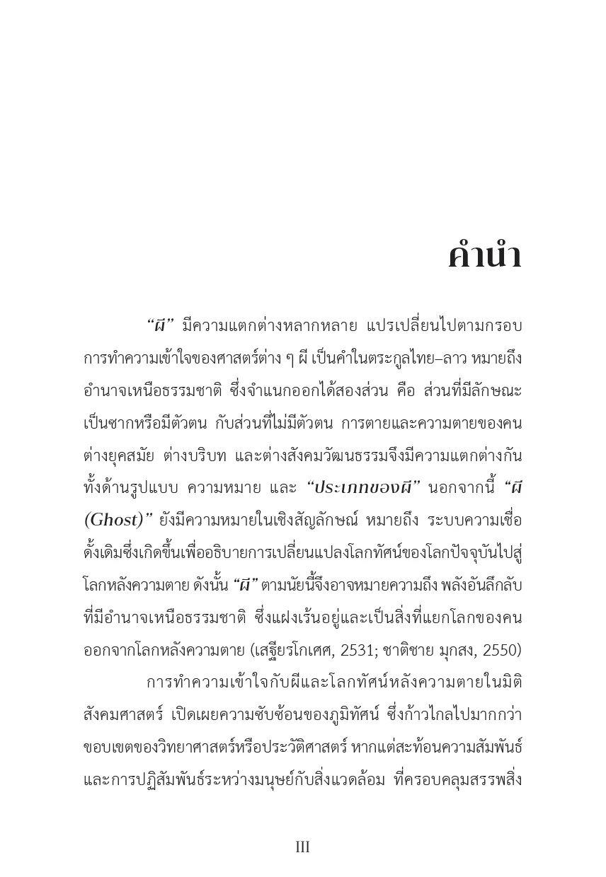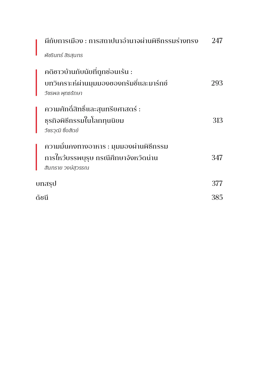 หนังสือ “ผี ร่างทรง และพิธีกรรม” เปิดเผยการดำรงอยู่ของ ลัทธิบูชาความมั่งคั่งรูปแบบใหม่ ๆ ที่เติบโตเบ่งบานในสภาวะสมัยใหม่ ซึ่งไม่ได้ มุ่งเน้นเพียงการเซ่นไหว้บูชา แต่การปรากฏตัวของผี ร่างทรง และพิธีกรรมไสยศาสตร์ ในศตวรรษที่ 21 สะท้อนความคิดสร้างสรรค์ การปรับตัว พลวัตของการให้ความหมาย และการทำความเข้าใจกับกระบวนการสร้างความศักดิ์สิทธิ์ ที่เลื่อนไหล การปรากฏตัวของผี ผ่านร่างทรง และพิธีกรรมที่ปราศจากรหัสสัญญะทางศาสนา หากแต่วางอยู่บนฐานคติ แนวปฏิบัติ ที่มุ่งตอบสนองความต้องการและการร้องขอที่ไม่เคยถูกได้ยิน เปิดเผยระบบความสัมพันธ์ที่แน่นแฟ้นระหว่าง คนกับผีและอำนาจเหนือธรรมชาติ โครงข่ายตลาดผีและพิธีกรรมพ้นพรมแดน ซึ่งสร้างความพึงใจเชิงสุนทรียะและฤทธานุภาพที่พ้องกับความทรงจำและจินตนาการผู้คนในสังคม ผ่านการบอกเล่าความจริงด้วยเหตุผลชุดใหม่และ ผู้แสดงกลุ่มใหม่