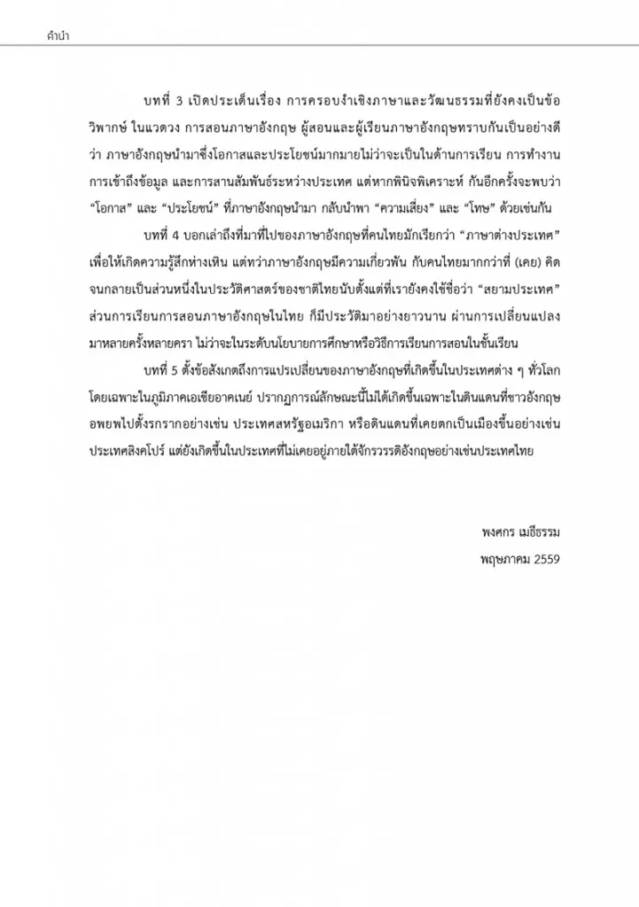 ในสถานการณ์ที่ทุกคนมุ่งเรียนภาษาอังกฤษเพื่อให้ผ่านการทดสอบ มีโอกาสได้งานและเงินเดือนที่ดี ประเด็นในด้านมายาคติ ความสัมพันธ์เชิงอำนาจและการครอบงำทางภาษาจึงไม่ได้รับการหยิบยกมาพูดถึงในแวดวงการเรียนการสอนภาษาอังกฤษ ทั้ง ๆ ที่ประเด็นเหล่านี้ไม่ได้ถูกปิดบังอำพรางและปรากฏต่อสังคมอย่างเปิดเผย แต่หลายคนกลับรู้สึกคุ้นเคยเสียจนคิดว่าเป็นเรื่องปกติธรรมดา นักวิชาการทางภาษาอังกฤษจำนวนหนึ่งได้พยายามหยิบยกประเด็นเหล่านี้มากล่าวถึงให้มากขึ้น เพื่อให้สังคมเข้าใจสถานการณ์ความเป็นไปของภาษาอังกฤษในฐานะภาษานานาชาติ แล้วนำไปพิจารณาความเชื่อ ค่านิยมและคุณค่าที่ยึดถืออยู่ให้รอบด้านมากขึ้น