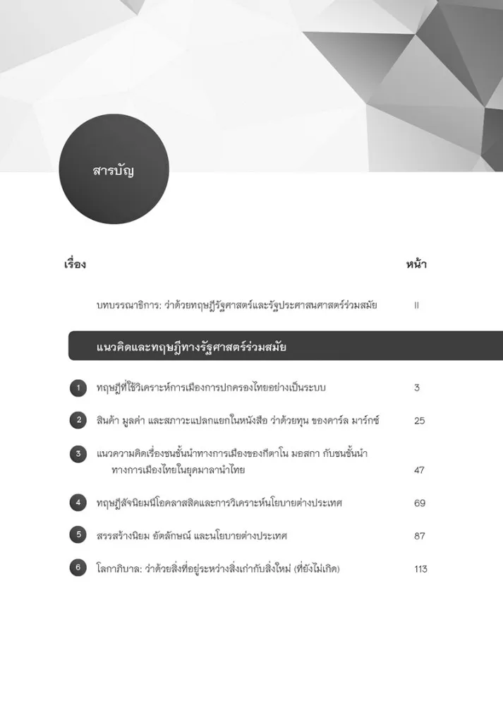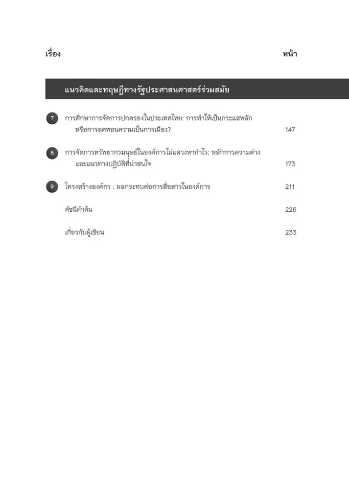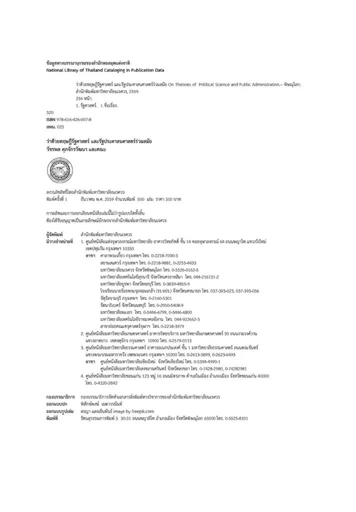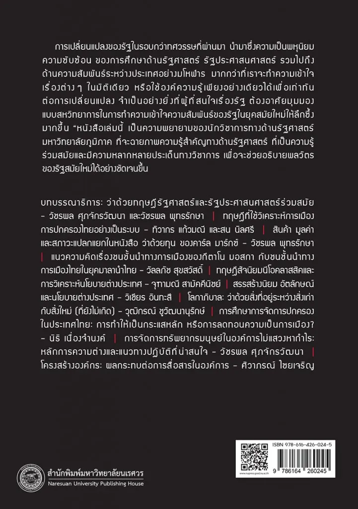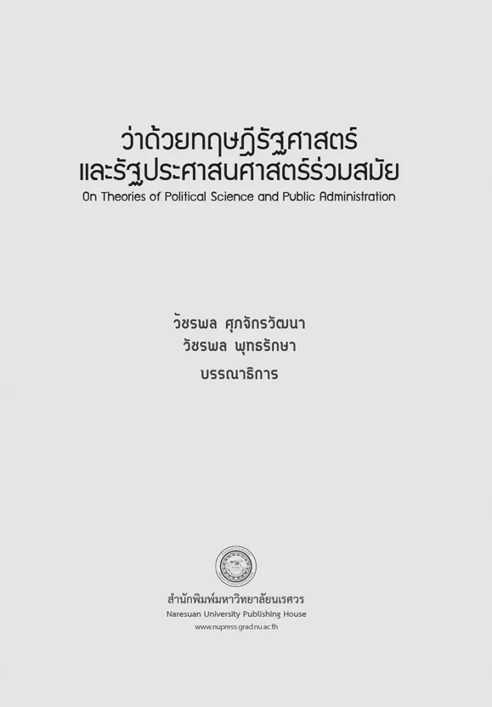 ว่าด้วยทฤษฎีรัฐศาสตร์ และรัฐประศาสนศาสตร์ร่วมสมัย On Theories of Political Science and Public Administration การเปลี่ยนแปลงของรัฐในรอบกว่าทศวรรษที่ผ่านมา นำมาซึ่งความเป็นพหุนิยมความซับซ้อน ของการศึกษาด้านรัฐศาสตร์ รัฐประศาสนศาสตร์ รวมไปถึง ด้านความสัมพันธ์ระหว่างประเทศอย่างมโหฬาร มากกว่าที่เราจะทำความเข้าใจเรื่องต่าง ๆ ในมิติเดียว หรือใช้องค์ความรู้เพียงอย่างเดียวได้เพื่อเท่าทันต่อการเปลี่ยนแปลง จำเป็นอย่างยิ่งที่ผู้ที่สนใจเรื่องรัฐ ต้องอาศัยมุมมอง แบบสหวิทยาการในการทำความเข้าใจความสัมพันธ์ของรัฐในยุคสมัยใหม่ให้ลึกซึ้งมากขึ้น “หนังสือเล่มนี้ เป็นความพยายามของนักวิชาการทางด้านรัฐศาสตร์ มหาวิทยาลัยภูมิภาค ที่จะฉายภาพความรู้สำคัญทางด้านรัฐศาสตร์ ที่เป็นความรู้ร่วมสมัยและมีความหลากหลายประเด็นทางวิชาการ เพื่อจะช่วยอธิบายพลวัตรของรัฐสมัยใหม่ได้อย่างชัดเจนขึ้น