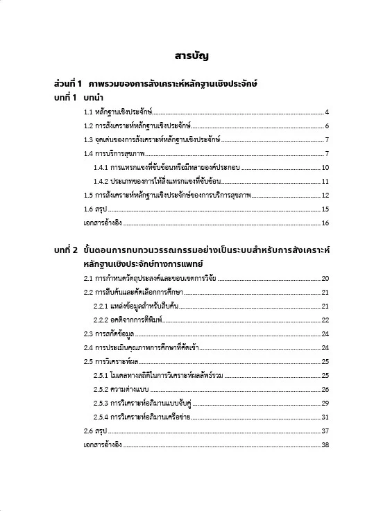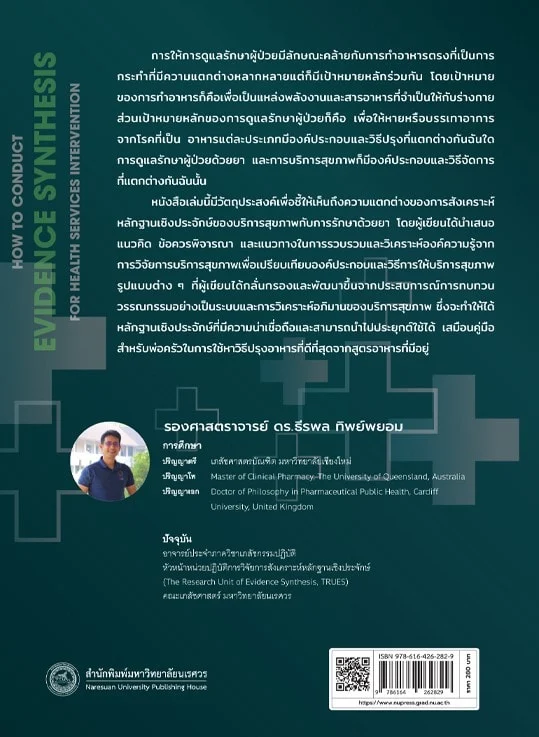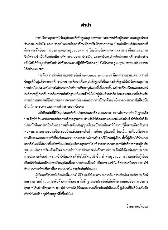 หนังสือเล่มนี้มีวัตถุประสงค์เพื่อชี้ให้เห็นถึงความแตกต่างของการสังเคราะห์หลักฐานเชิงประจักษ์ของการบริการสุขภาพกับการรักษาด้วยยา โดยผู้เขียนได้นำเสนอแนวคิด ข้อควรพิจารณา และแนวทางในการรวบรวมและวิเคราะห์องค์ความรู้จากการวิจัยการบริการสุขภาพเพื่อเปรียบเทียบองค์ประกอบและวิธีการให้บริการสุขภาพรูปแบบต่าง ๆ ที่ผู้เขียนได้กลั่นกรองและพัฒนาขึ้นจากประสบการณ์การทบทวนวรรณกรรมอย่างเป็นระบบและการวิเคราะห์อภิมานของการบริการสุขภาพ ซึ่งจะทำให้ได้หลักฐานเชิงประจักษ์ที่มีความน่าเชื่อถือและสามารถนำไปประยุกต์ใช้ได้ เสมือนคู่มือสำหรับพ่อครัวแม่ครัวในการใช้หาวิธีปรุงอาหารที่ดีที่สุดจากสูตรอาหารที่มีอยู่
