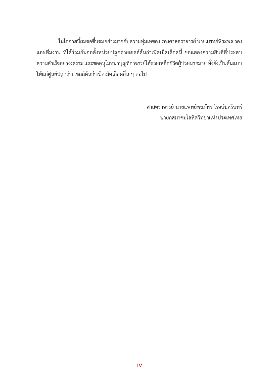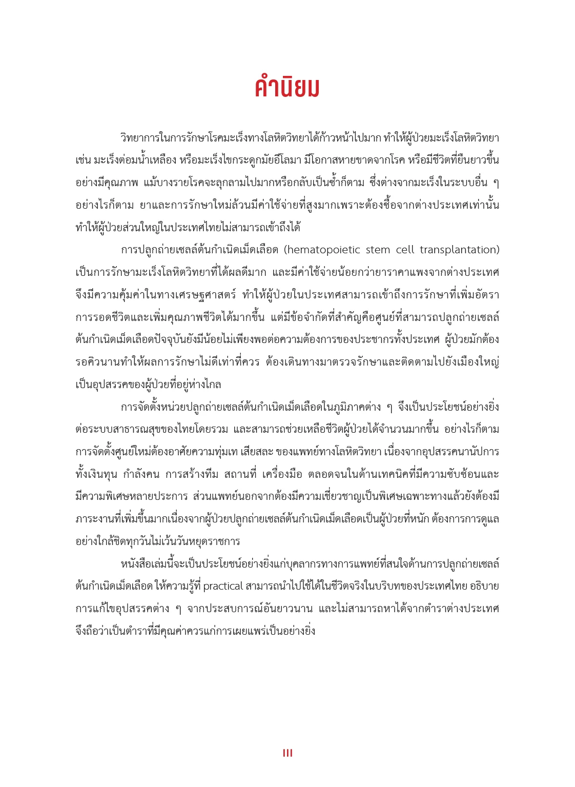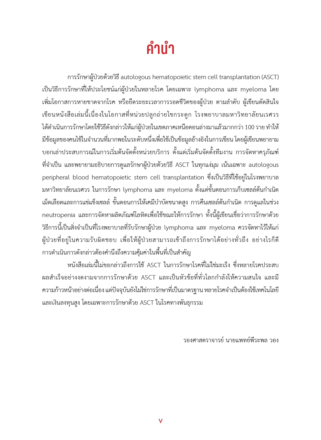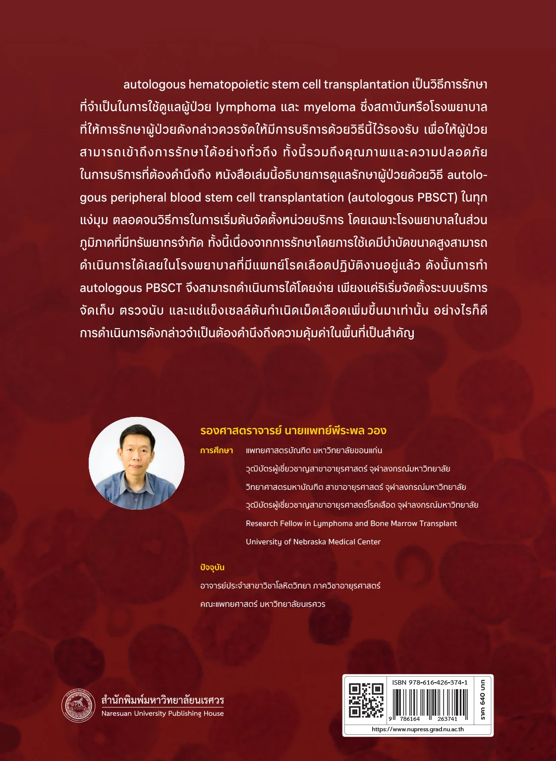 autologous hematopoietic stem cell transplantation เป็นวิธีการรักษาที่จำเป็นในการใช้ดูแลผู้ป่วย lymphoma และ myeloma ซึ่งสถาบันหรือโรงพยาบาล ที่ให้การรักษาผู้ป่วยดังกล่าวควรจัดให้มีการบริการด้วยวิธีนี้ไว้รองรับ เพื่อให้ผู้ป่วยสามารถเข้าถึงการรักษาได้อย่างทั่วถึง ทั้งนี้รวมถึงคุณภาพและความปลอดภัย ในการบริการที่ต้องคำนึงถึง หนังสือเล่มนี้อธิบายการดูแลรักษาผู้ป่วยด้วยวิธี autologous peripheral blood stem cell transplantation (autologous PBSCT) ในทุกแง่มุม ตลอดจนวิธีการในการเริ่มต้นจัดตั้งหน่วยบริการ โดยเฉพาะโรงพยาบาลในส่วนภูมิภาคที่มีทรัพยากรจำกัด ทั้งนี้เนื่องจากการรักษาโดยการใช้เคมีบำบัดขนาดสูงสามารถดำเนินการได้เลยในโรงพยาบาลที่มีแพทย์โรคเลือดปฏิบัติงานอยู่แล้ว ดังนั้นการทำ autologous PBSCT จึงสามารถดำเนินการได้โดยง่าย เพียงแค่ริเริ่มจัดตั้งระบบบริการจัดเก็บ ตรวจนับ และแช่แข็งเซลล์ต้นกำเนิดเม็ดเลือดเพิ่มขึ้นมาเท่านั้น อย่างไรก็ดี การดำเนินการดังกล่าวจำเป็นต้องคำนึงถึงความคุ้มค่าในพื้นที่เป็นสำคัญ