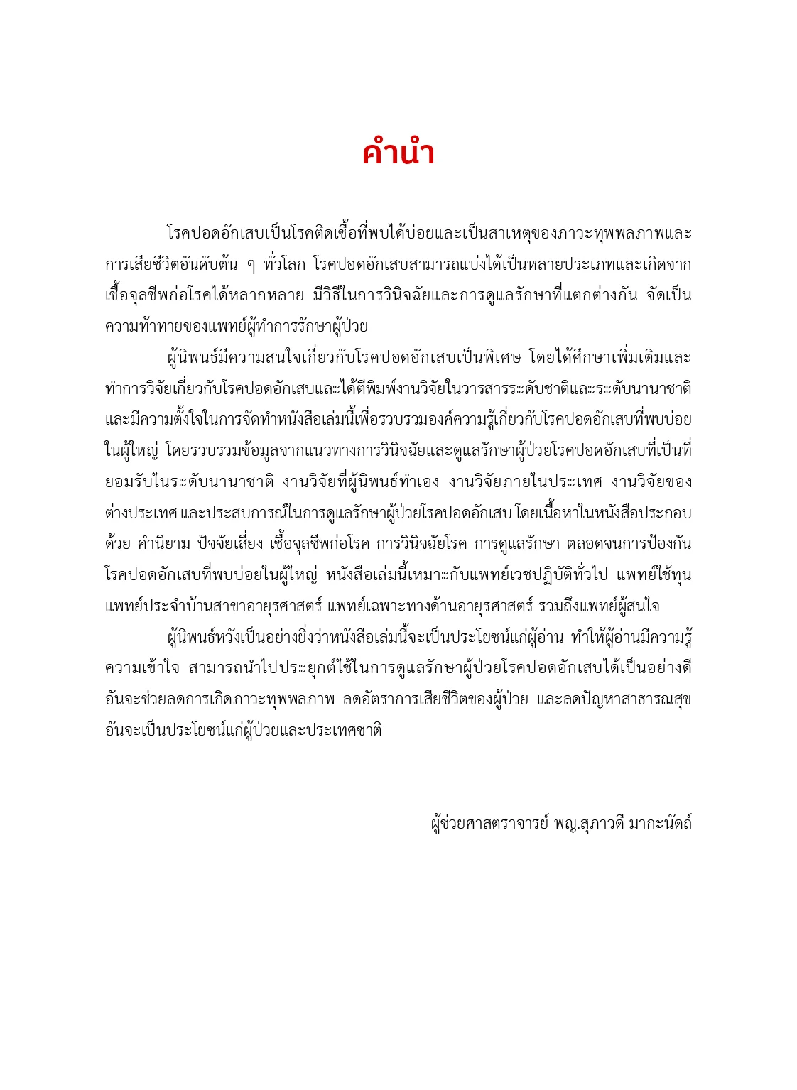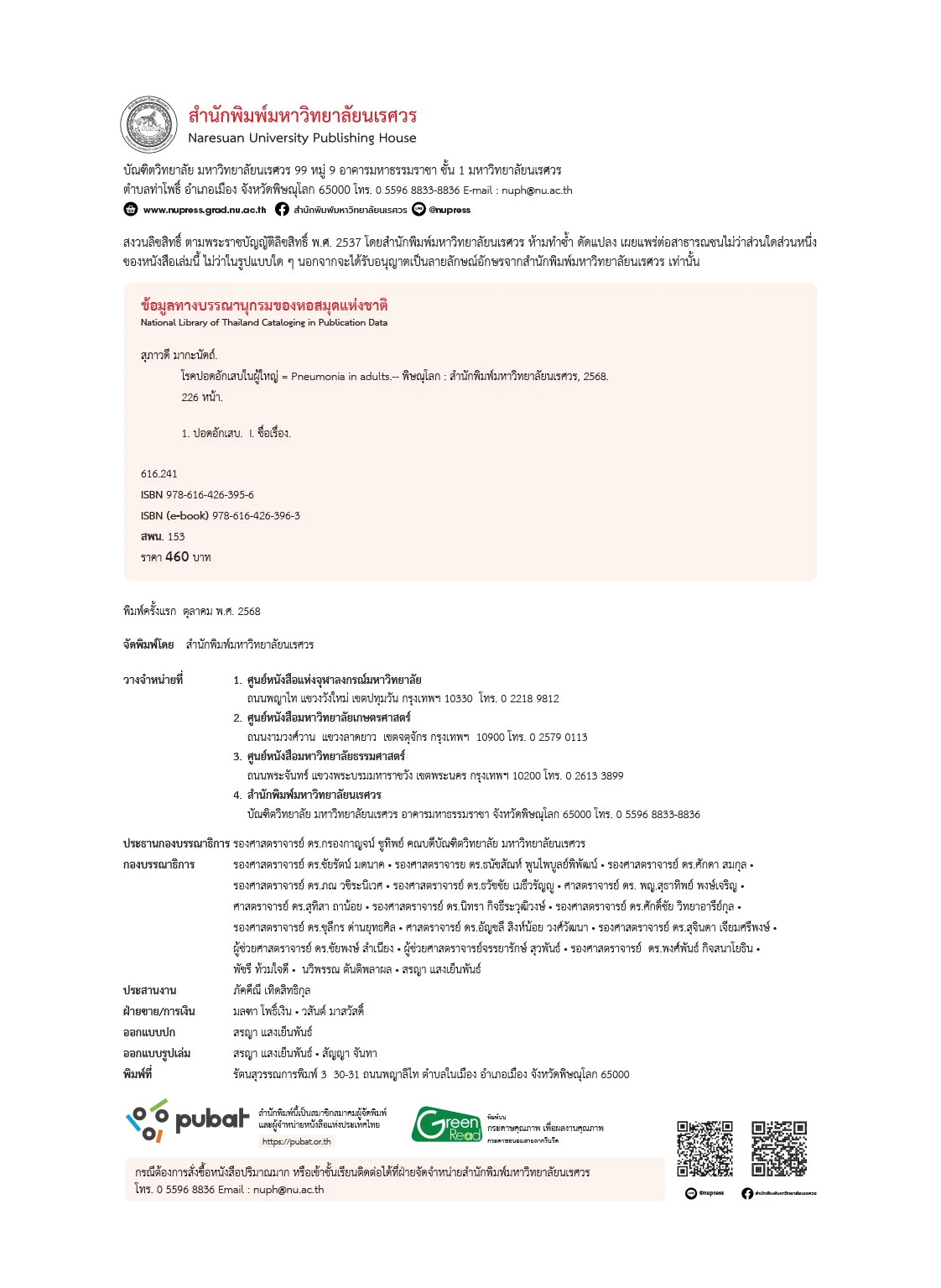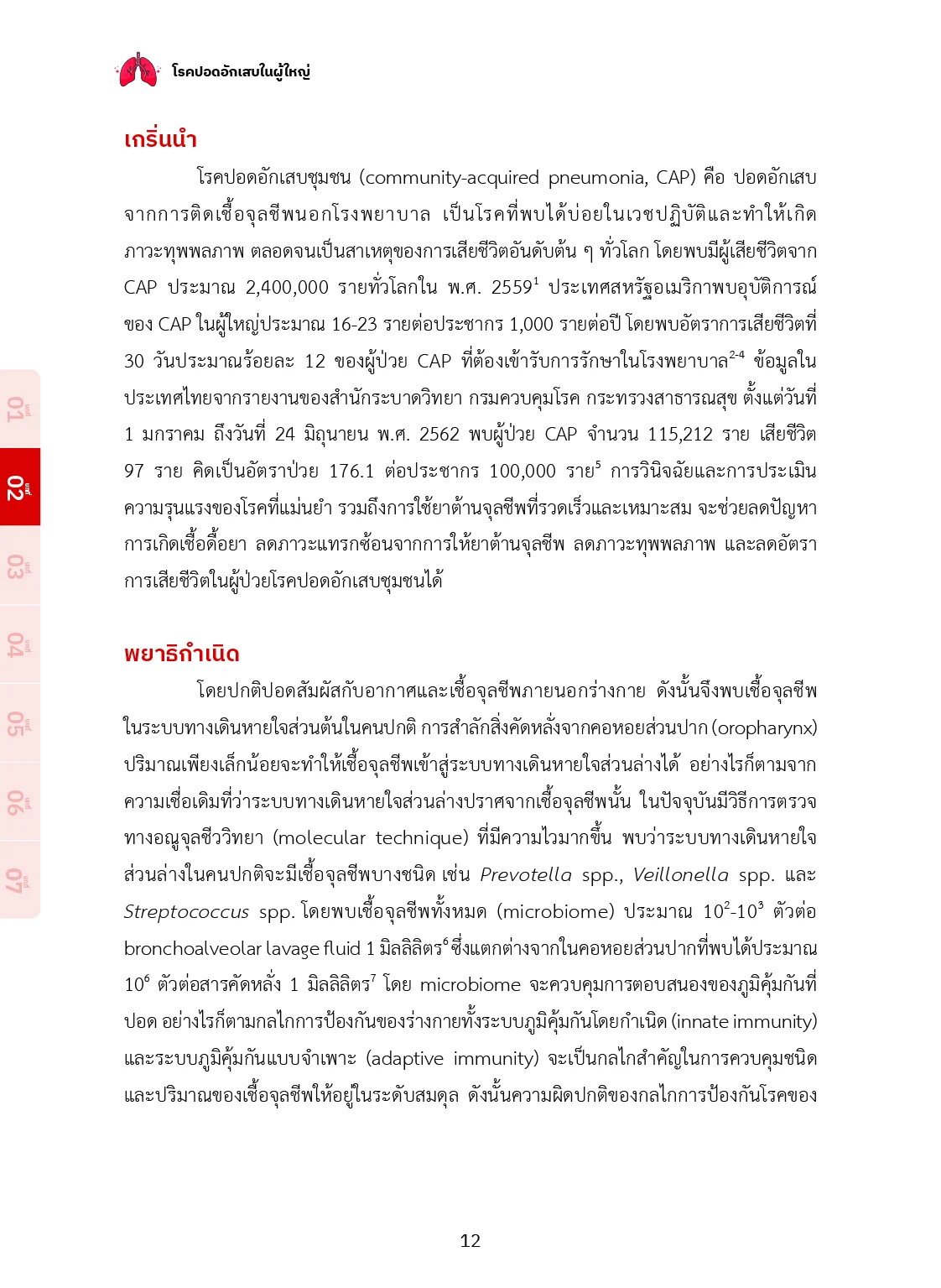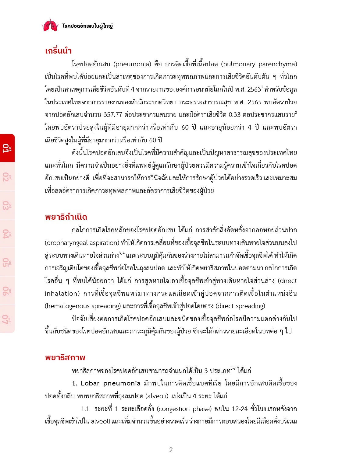 โรคปอดอักเสบเป็นโรคติดเชื้อที่พบได้บ่อยและนับเป็น ปัญหาสาธารณสุขสำคัญทั้งในประเทศไทยและของโลก ในปี พ.ศ. 2563 ได้เกิดการแพร่ระบาดของโรคโควิด 19 ไปทั่วโลก ส่งผลให้มีผู้เสียชีวิตเป็นจำนวนมาก หนังสือเล่มนี้ได้รวบรวม องค์ความรู้เกี่ยวกับโรคปอดอักเสบที่พบบ่อยในผู้ใหญ่ รวมถึง โรคปอดอักเสบจากการติดเชื้อโควิด 19 โดยครอบคลุม คำนิยาม พยาธิกำเนิด ปัจจัยเสี่ยง เชื้อจุลชีพก่อโรค การวินิจฉัยโรค การดูแลรักษา ตลอดจนการป้องกันโรค