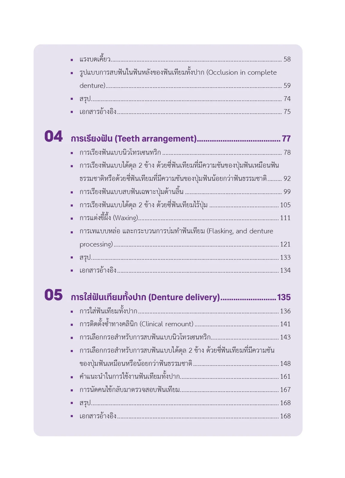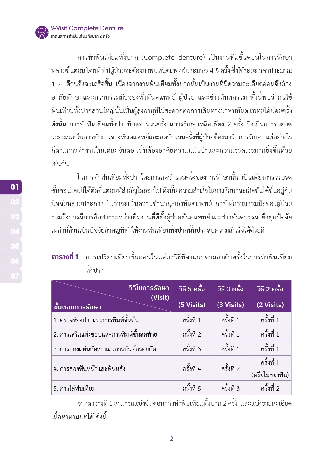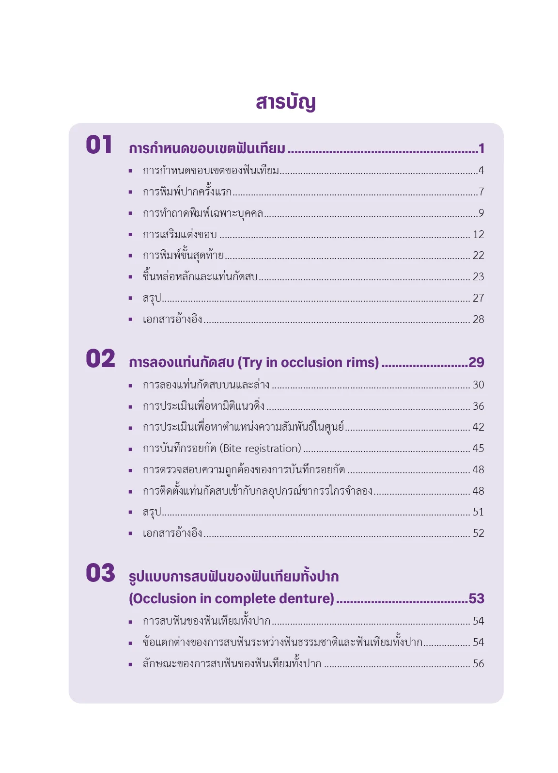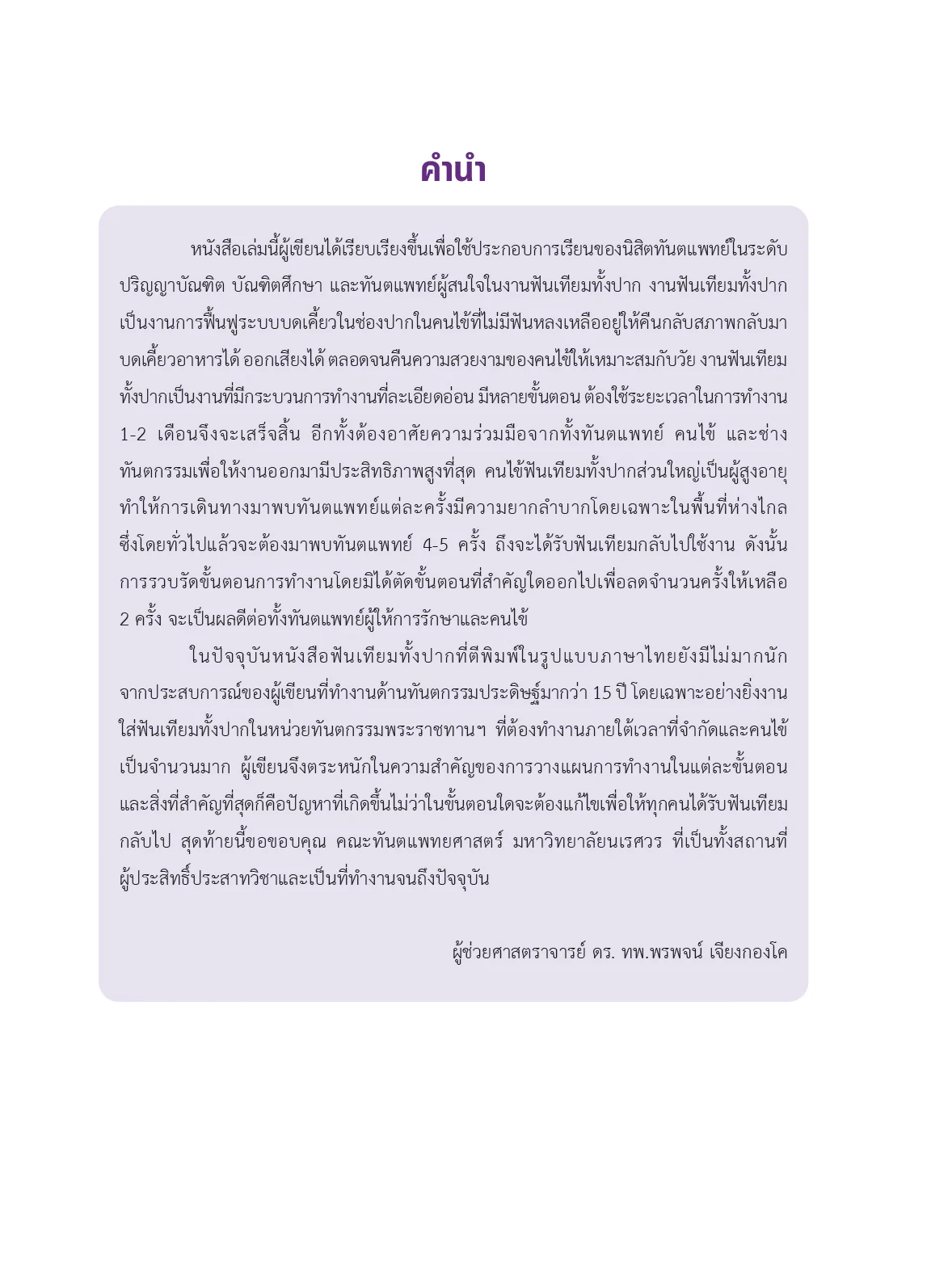 ฟันเทียมทั้งปากเป็นงานที่ต้องใช้ทั้งศาสตร์และศิลป์และมีกระบวนการทำงานหลายขั้นตอนเพื่อให้บรรลุเป้าหมายที่สำคัญคือ เพื่อให้คนไข้สามารถใช้งานบดเคี้ยวอาหารได้ หนังสือเล่มนี้เหมาะสำหรับนิสิตระดับปริญญาตรี ระดับบัณฑิตศึกษา และทันตแพทย์ทั่วไป โดยเสนอขั้นตอนการทำฟันเทียมทั้งปากจากการที่คนไข้ ต้องมาพบทันตแพทย์ 4-5 ครั้ง ให้เหลือเพียง 2 ครั้ง โดยกระบวนการรักษานี้ ไม่ได้ตัดขั้นตอนใดที่สำคัญออกไป เพียงแต่รวบรัดและแนะนำวิธีการที่สามารถทำงาน ได้เร็วขึ้นทั้งในคลินิกและห้องปฏิบัติการ นอกจากนี้ยังกล่าวถึงวิธีการทำฟันเทียมให้มีความสวยงามเป็นธรรมชาติเพื่อให้เหมาะสมกับคนไข้แต่ละราย และสุดท้าย ได้เสนอวิธีการแก้ไขเมื่อเกิดปัญหาทั้งระหว่างการทำฟันเทียมหรือภายหลังจาก ได้รับฟันเทียมไปแล้ว