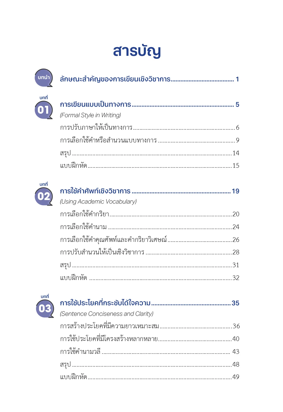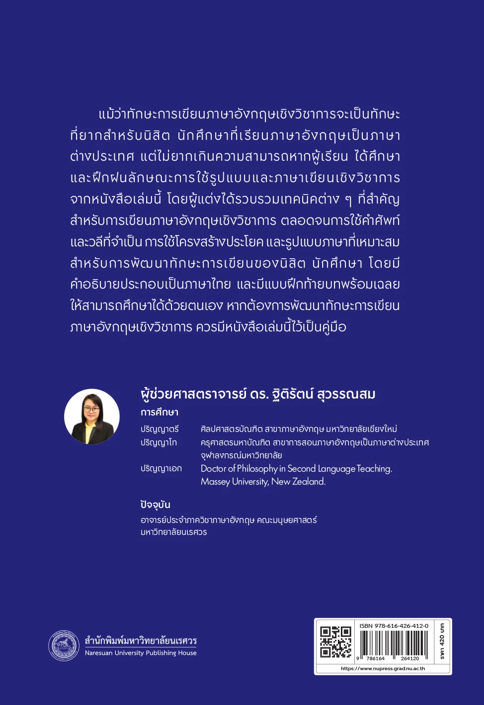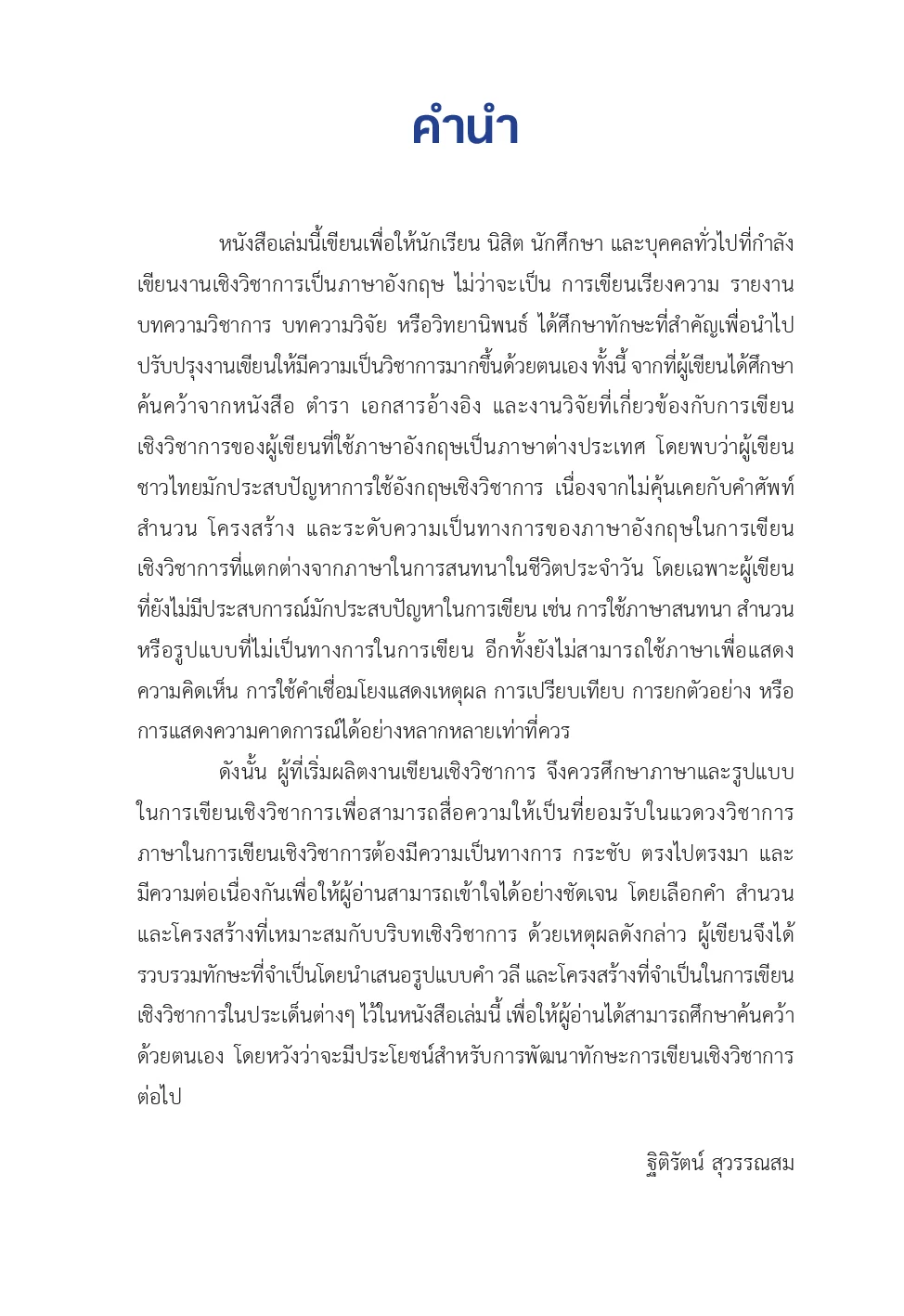 แม้ว่าทักษะการเขียนภาษาอังกฤษเชิงวิชาการจะเป็นทักษะที่ยากสำหรับนิสิต นักศึกษาที่เรียนภาษาอังกฤษเป็นภาษาต่างประเทศแต่ไม่ยากเกินความสามารถหากผู้เรียนได้ศึกษาและฝึกฝนลักษณะการใช้รูปแบบและภาษาเขียนเชิงวิชาการจากหนังสือเล่มนี้ โดยผู้แต่งได้รวบรวมเทคนิคต่าง ๆ ที่สำคัญสำหรับการเขียนภาษาอังกฤษเชิงวิชาการ ตลอดจนการใช้คำศัพท์และวลีที่จำเป็น การใช้โครงสร้างประโยค และรูปแบบภาษาที่เหมาะสมสำหรับการพัฒนาทักษะการเขียนของนิสิต นักศึกษา โดยมีคำอธิบายประกอบเป็นภาษาไทย และมีแบบฝึกท้ายบทพร้อมเฉลยให้สามารถศึกษาได้ด้วยตนเอง หากต้องการพัฒนาทักษะการเขียนภาษาอังกฤษเชิงวิชาการ ควรมีหนังสือเล่มนี้ไว้เป็นคู่มือ